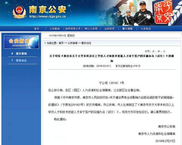 今天,南京公安官方网站发布由南京市公安局会同市人社局研究制定《南京市关于大学本科以上学历人才和技术技能人才来宁落户的实施办法(试行)》,该办法于3月1日正式实施。