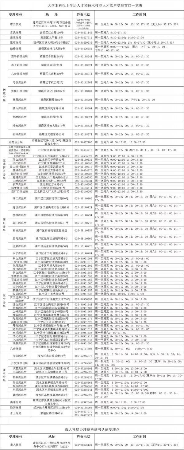 大学本科以上学历人才和技术技能人才落户受理窗口一览表