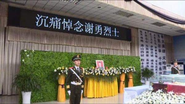 追悼会大厅内摆满了社会各界送来的花圈,现场气氛肃穆凝重。大家为谢勇默哀三分钟,并回顾了他短暂而又光荣的一生。整个追悼会进行了约半个小时,人们依次向烈士谢勇的遗体敬献了白菊,鞠躬致敬。