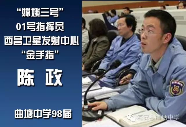 陈政 ,1998年从海安县曲塘中学毕业,考入南京航空航天大学。2002年来到西昌卫星发射中心工作。