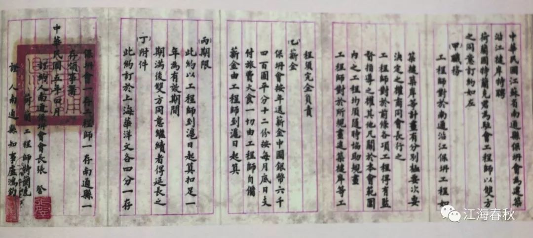 港闸区档案馆馆藏的38399卷68639件档案中,有86件民国档案,其中绝大多数是“特来克与南通保坍史料”,有南通保坍会会长张詧与特来克签订的中(英)文版聘书、特来克撰写的南通保坍计划报告书和特来克设计的水楗图及说明等,这些是档案馆的“镇馆之宝”。