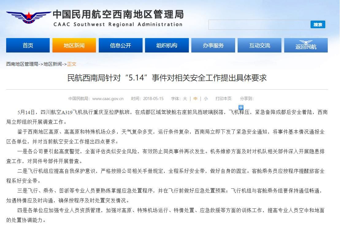 四川航空“5.14”紧急备降事件的第二天(5月15日),民航西南局针对“5.14”事件对相关安全工作提出了具体要求。