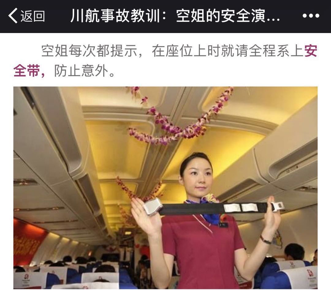 5月15日,荔枝新闻就发布了独家解读专稿《 川航事故教训:空姐的安全演示你真的看懂了?》(点击可阅读),详细讲解了在这次事件中有关飞机上“安全带”和“氧气面罩”使用的注意事项。