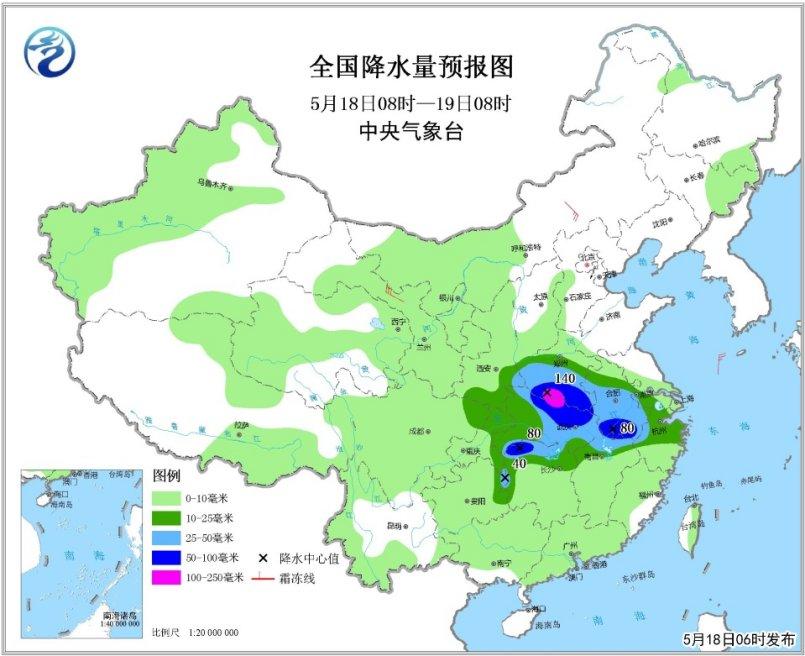 5月18日08时至19日08时,河南南部、湖北中东部、湖南北部、江西北部、安徽中南部、陕西东南部等地的部分地区有大雨或暴雨,其中河南南部、湖北北部局地有大暴雨(100~140毫米);上述部分地区并伴有短时强降水、雷暴大风等强对流天气。甘肃中部、内蒙古中部、华北北部等地的部分地区有4~6级风。