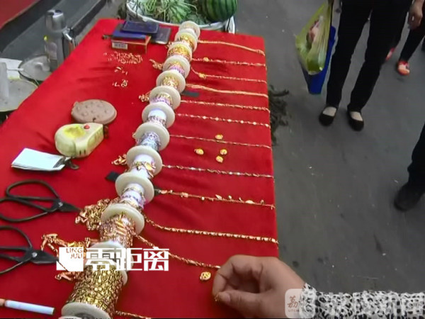 今天(5月21日)早晨7点多钟,家住南京城北的陈奶奶去五所村菜市场买菜,路边摆摊的一对男女叫住她,说戴上他们卖的“金项链”可以治病,而且“金项链”一条只要3块钱,真有那么好的事吗?