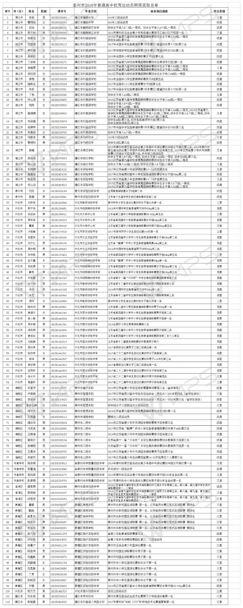根据《市教育局关于做好2018年全市普通高中学校照顾录取优秀学生运动员工作的通知》(泰教体艺〔2018〕7号),5月20日,市教育局、市体育局对申报2018年全市普通高中学校照顾录取优秀学生运动员材料进行了审核。现将审核通过的名单进行公示,公示时间2018年5月20日--26日。