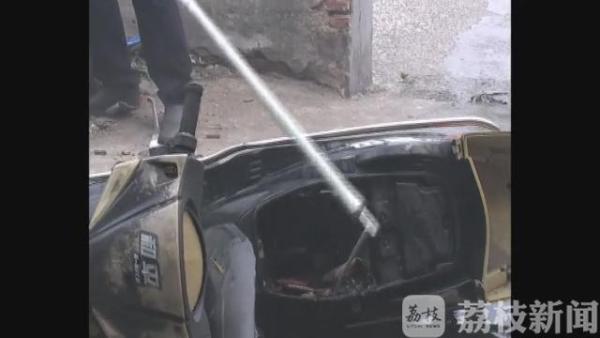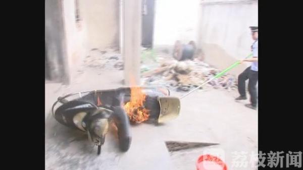 根据测试安排,张浦镇花园村的一栋废弃民房内,一辆电动车起火燃烧,浓烟充斥了整个房间。试验民警拿出一根“长杆”勾住电动车尾部,一把就将车拖拽至空旷处,随后,消防队员迅速用水将火浇灭。