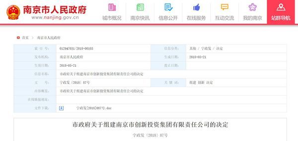 5月25日,南京市政府发布《关于组建南京市创新投资集团有限责任公司的决定》。市政府研究决定,组建南京市创新投资集团有限责任公司(简称“创投集团”)。