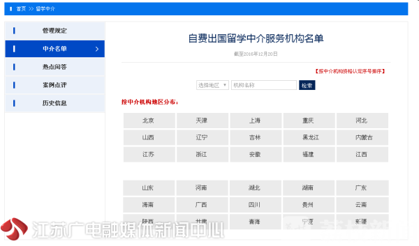 申请出国,最怕遇到“黑中介”,怎么辨别?教育部留学服务中心出国处处长丁莉介绍,登陆教育部官方的“教育涉外监管信息网”,可以查到完整的“自费出国留学中介服务机构名单”,那上面收集的都是跟中国政府的教育有备忘的。江苏目前在册的有28家。