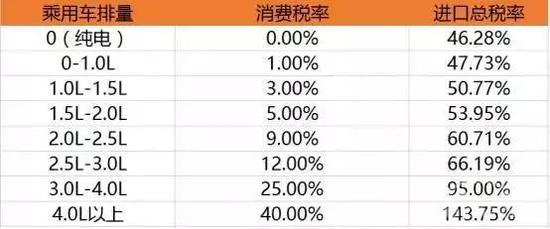 汽车进口环节税收包括关税、消费税、增值税。消费税为价内税,根据排量不同,税率从1%到40%不等,如排量为“1.5-2.0升(含)”、“2.5-3.0升(含)”的税率分别为5%、12%。我国增值税为价外税,税率为17%。