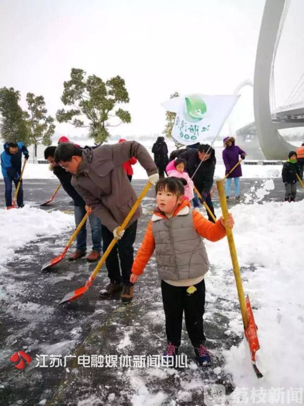 跑团的微信群里发出这样的一份通知:“这几天,为战胜2018年第二场大雪,全市的解放军、城管、环卫工、保洁员、社工、志愿者等,同城同心,扫雪除冰!我们‘江豚湾湾’酷跑团的目标就是:为QQ桥减负,为滨江跑者扫除障碍!”通知发出当天,就有50多个家庭报名参加扫雪,不少跑二代的小朋友也积极参与。经过努力,被积雪覆盖的南京眼很快扫出一条通道。
