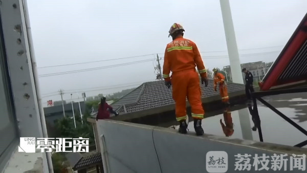 一名女子坐在楼顶的边缘,随时可能发生意外,消防员到场后,立即在下方铺设救生气垫,同时与女子进行交流,发现女子手上有一把剪刀,救援人员没有继续接近女子。