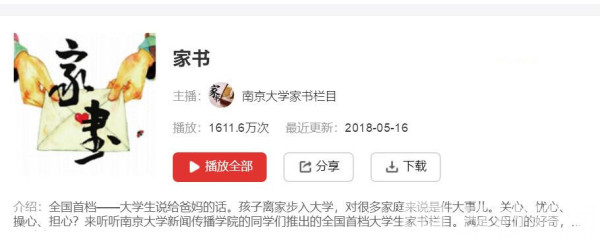 南京大学家书编辑部推出的全国首档大学生家书栏目,从2016年底在蜻蜓FM上线以来,已经制作了200多期,累计获得了超过1600万的播放量。在首届大学生校园媒体大赛孙明经奖的评奖活动中,他们获得了优秀校媒奖。