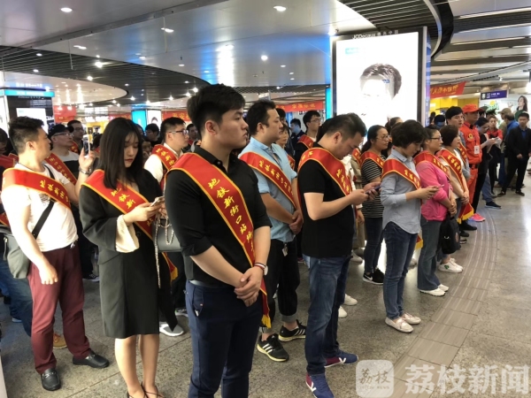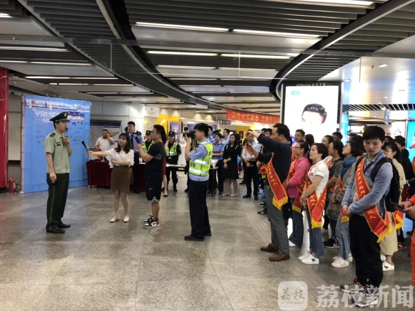 5月26日上午,南京地铁警方在地铁新街口站举行南京地铁“平安合伙人”招募活动,并为新加入的百名“平安合伙人”授予绶带。