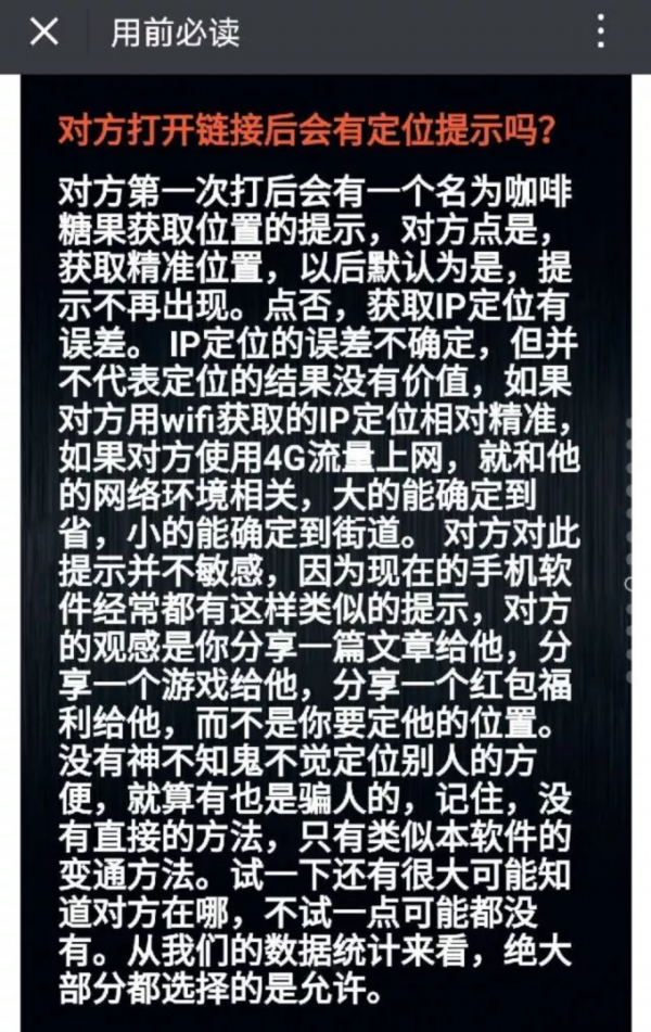 卖家表示,当被定位者点开这些链接时,只会收到一个申请获得地理位置等信息的提示,如果被定位者点击“确定”,那么其地理位置信息将被精准定位,同时以后再打开类似链接都会被该定位软件默认为“允许”。