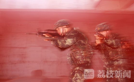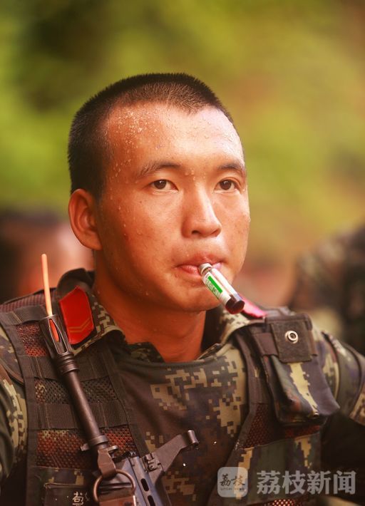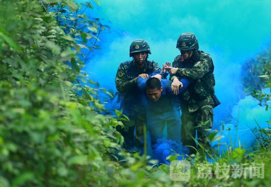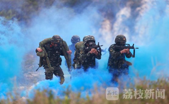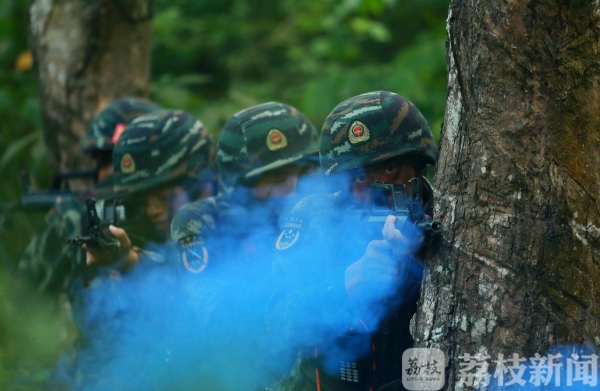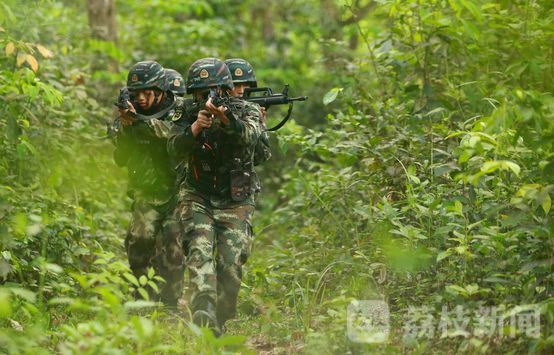 “两名境外恐怖分子非法入境后逃往三亚西南方热带雨林,上级命令我部迅速对其实施围歼”,刚刚完成10公里全副武装越野的特战队员们,迅速进入热带丛林,一场红蓝对抗就这样打响了,特战队员们在天气闷热、极度疲劳的情况下,顶着蚊虫叮咬,用手扒、用刀劈,每一步都异常困难,经过3小时的紧张搜索,“砰、砰、砰……”烟雾弹、爆震弹相继在队伍中炸响,蓝色的烟雾迅速弥漫开来,特战队员迅速进入战斗状态。“卧倒!”“分散!”发烟弹炸响的瞬间,特战中队副中队长曾春海下达指令,队员迅速到路边的深沟里隐蔽。3名“蓝军”组成的“匪徒”实施偷袭后撤离,特战队员以小队为单位展开武装追逃。