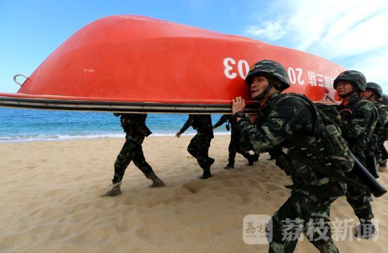 接下来的科目在真正的海滩上开始了,柔软的海滩、凉爽的海风让官兵们开心不已,可这种好心情没有维持多久,导调组根本不按套路出牌,沙滩扛冲锋舟5公里、水中托举子弹箱1个小时……一上午训练下来,大家对沙滩海浪再也没有好感,看似柔软的沙滩其实很卸力,用尽力却跑不快。看似温柔的海水却是又苦又咸,海水侵泡过的子弹箱无比沉重。官兵们很快就精疲力尽了。