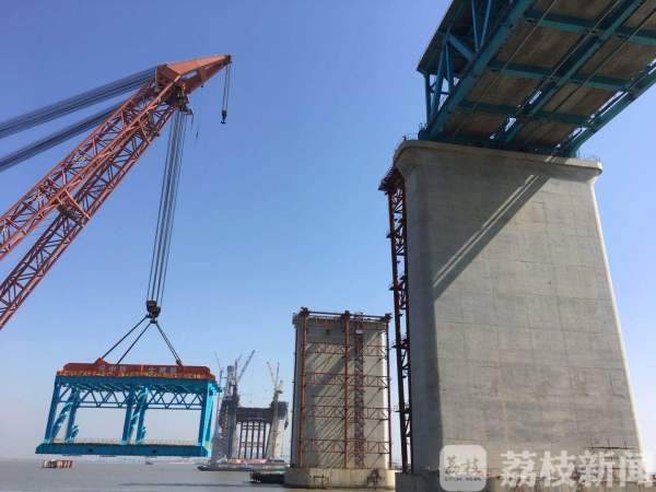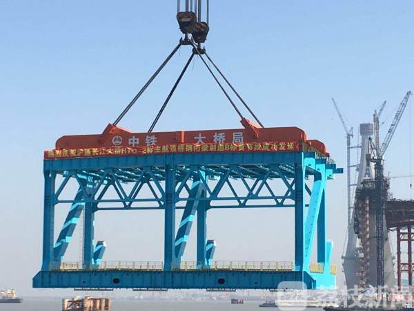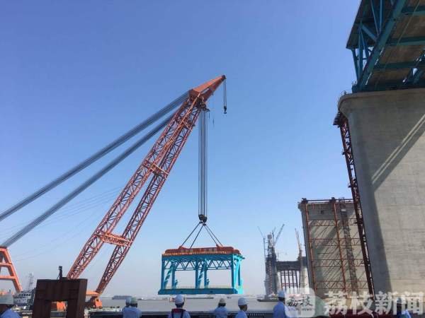 今天(6月1日)下午两点,重达1210吨的大节段钢梁被稳稳地吊装在31号墩墩顶之上,由中铁大桥局承建的沪通长江大桥主航道桥边墩首个超千吨大节段钢梁架设完成,比原计划工期提前了16天。