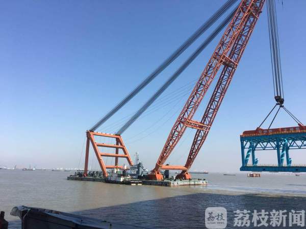 据施工单位中铁大桥局沪通长江大桥项目部二分部项目经理宁朝新介绍,此次吊装的钢梁长度22米、桁宽35米、桁高16米、重达1210吨,为目前大桥最重的节段钢梁。该钢梁在江苏如皋基地生产,出厂后由万吨轮整节段装载运输至墩位,再由1800吨浮吊实施吊装作业。吊装作业前,中铁大桥局采用BIM模型动画模拟,对多个吊装方案进行一一比选,最终确定最优的吊装方案。