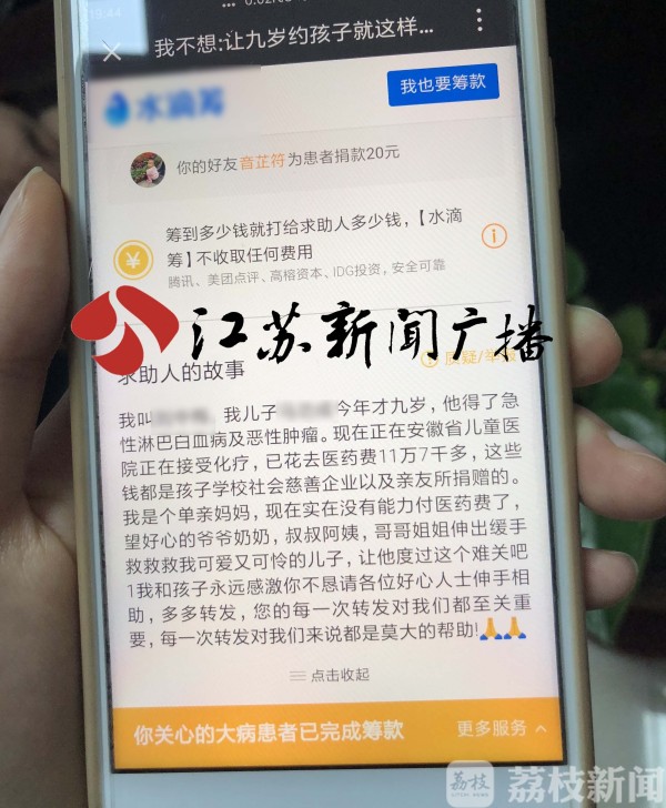 互联网筹款平台水滴筹的工作人员沈雯艺表示,自从成成生病以来,一直在负责和成成的母亲刘女士对接筹款事宜,在她看来,成成娘俩母子关系一直很好,自从孩子生病以来,刘女士可以说是全身心都扑在了儿子身上。“因为基本上都是单亲妈妈,都是一个人带他孩子,也没有看到她跟孩子发过脾气,在朋友圈里面也经常希望孩子能够早日康复,重返校园。”