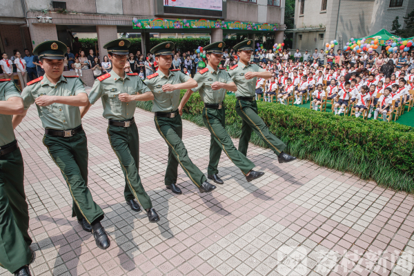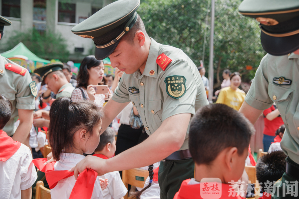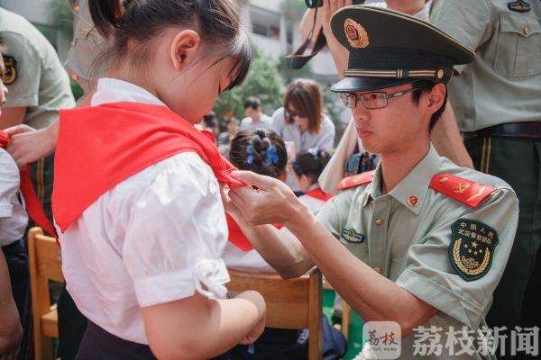 来自南京市消防支队和南京港边防检查站的官兵们挨个为学生戴上鲜艳的红领巾,新队员们个个小脸上洋溢着开心灿烂的笑容,他们等着脖子上佩戴鲜艳红领巾的那一刻,那是他们入队的幸福与光荣。随后,武警叔叔们还为新队员们献上了精彩的队列和军体拳表演。