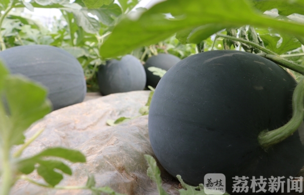 这个品种的西瓜“黑武士”是他们在2012年开始选育的适合运输的中熟黑皮西瓜,主要的特点是坐瓜性比较一致,早春的时候温度比较低,一般的西瓜不容易坐瓜,而这个品种耐低温性比较好一点,所以坐瓜非常一致,两边坐瓜都是一排排的。