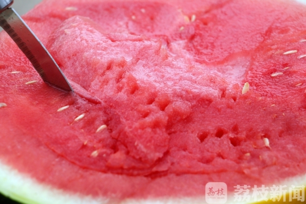 记者看到,这只西瓜虽然只有十几斤重,但140斤的马博士站上去之后,竟然不破不裂,毫发无损,剖开之后,瓤红汁多,让人垂涎欲滴,而且瓜皮也不厚。