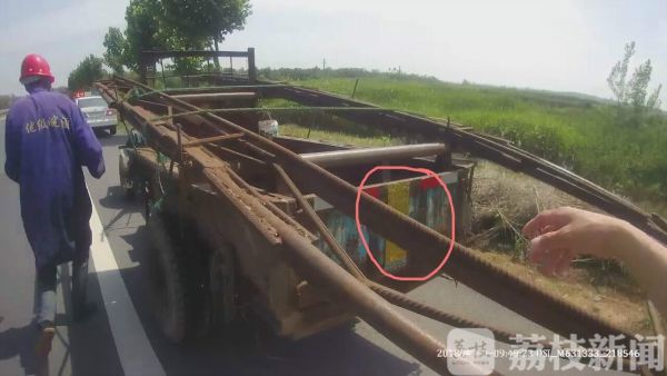 6月4日9时49分,南京六合交警大队大圣中队民警巡逻执勤时,发现一拖拉机具有超长嫌疑。民警立即示意该车靠边停车,并上前对该车进行检查,车主告诉民警,他的拖拉机有车牌也有车险,证件齐全,不存在违法。民警立即指出,该车上装载的铁架子就有超长嫌疑,同时民警在进一步检查中发现,该车的车牌中间部分被一掉色的对联给遮挡住了。