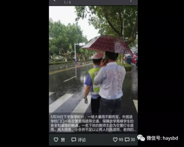 照片在朋友圈广为流传,近六万人为协警和老师点赞。许多家长表示,图片中的两个人平日都是熟面孔,他们坚守自己的岗位,默默奉献,做出了许多让人感动的事。