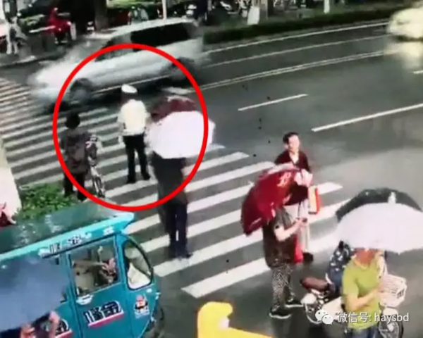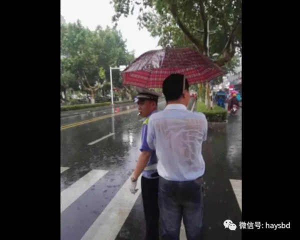 辅警他就一边在指挥,然后这位老师后背衣服都湿透了,完全不顾自己了,一直在为他撑伞,坚持了大概有三四十分钟这样。当时我说,哎呀,太感人了!这个一瞬间要把它记录下来,这种正能量要发到微信里面,让好多人为他点赞,就是这样子。