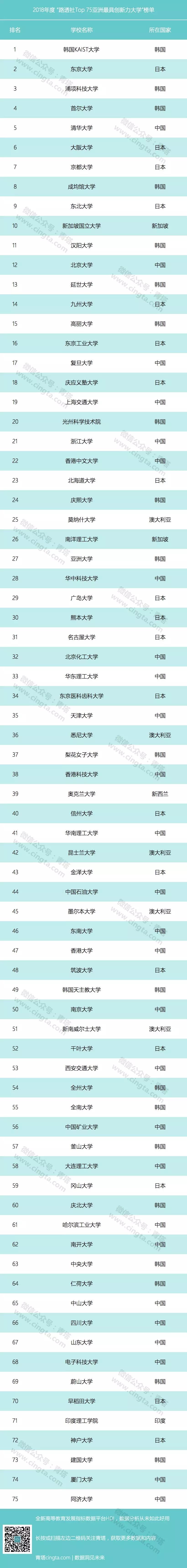 本次发布的亚洲最具创新力的大学榜单中,中国(入榜27所)与韩国(入榜20所)高校占据主导地位。韩国KAIST大学连续第三年被评为亚太地区最具创新力的大学。日本东京大学位居榜单第2位,相较2017年上升1位。韩国浦项科技大学居于第3位,同样前进1位,而首尔大学的排名在今年跌落2位,位居第4位。