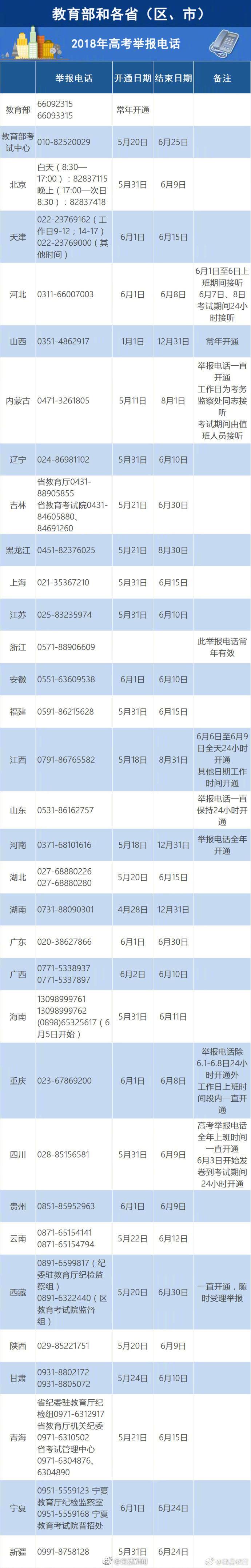 近日,教育部及全国31个省(区、市)教育行政部门和招生考试机构2018年高考举报电话公布。