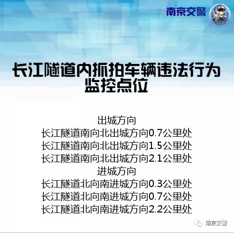 为进一步长江隧道内行车秩序,加强隧道内交通安全管理,南京交管部门对长江隧道内电子抓拍设备不断升级,自今日(6月5日)启用不系安全带、开车打电话电子警察抓拍。