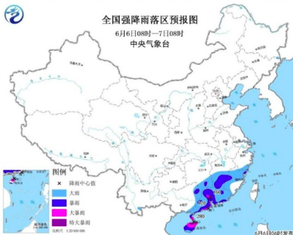 中国新闻网消息,据中央气象台网站消息,中央气象台6月6日06时继续发布暴雨黄色预警:受南海今年第4号台风和季风共同影响,预计未来四天,华南中东部多强降雨天气,海南岛北部、广东中西部沿海、广西东南部沿海等地的部分地区累积雨量可达300毫米,局地并伴有雷暴大风等强对流天气。详情》