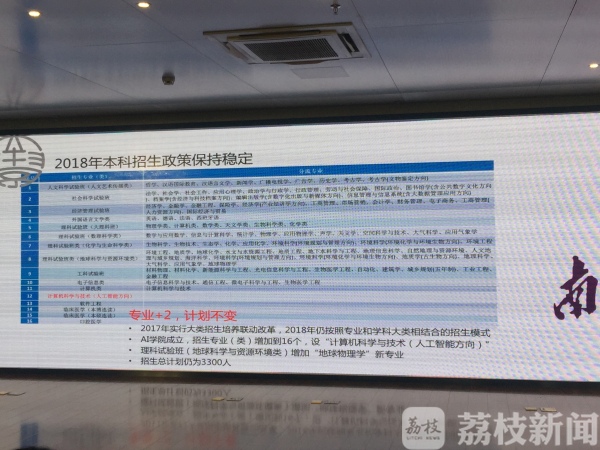 高考前一天,记者从南京大学举办的2018年本科招生政策发布会上获悉,今年该校本科生招生政策保持稳定,招生计划与去年保持相当,(去年为3300人),另外今年该校新增了“人工智能方向、地球物理学”两个专业。