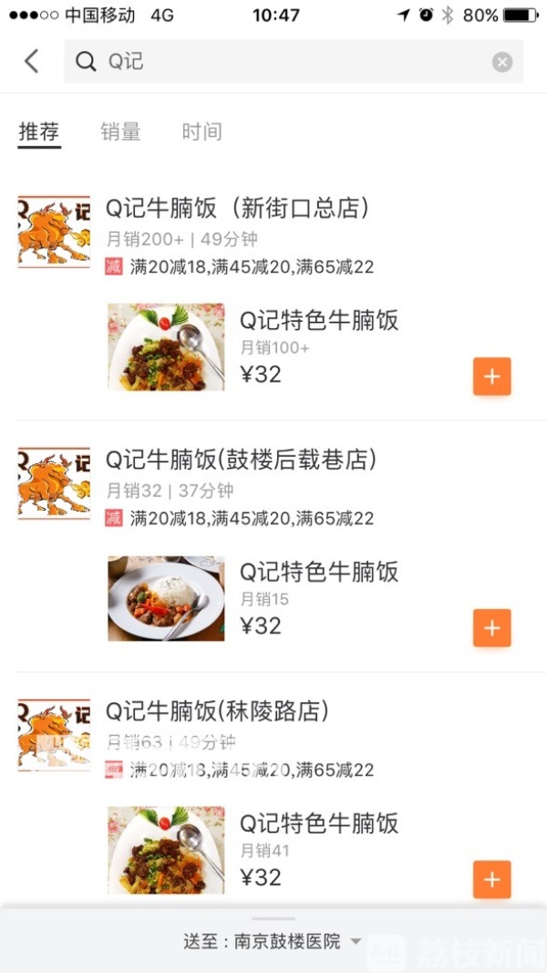 当着记者的面,周先生打开了滴滴外卖搜索,上面竟然有三家“Q记牛腩饭”,不仅有总店,还有分店,俨然一副连锁品牌店的样子。这让周先生非常恼火。