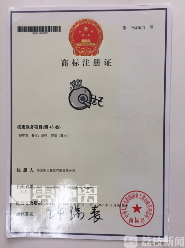 原来,周先生在2010年就注册了Q记品牌,并提供了商标注册证,核定项目有咖啡馆、餐厅、酒吧、茶馆,有效期到2020年。周先生说,自己没有和滴滴合作,更没有授权这三家店使用这个品牌。