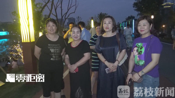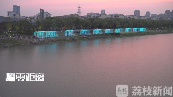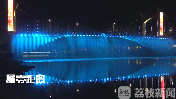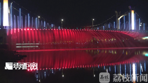 晚上八点钟,桥上的彩色喷泉开始了,市民们纷纷拿出手机拍照和视频。