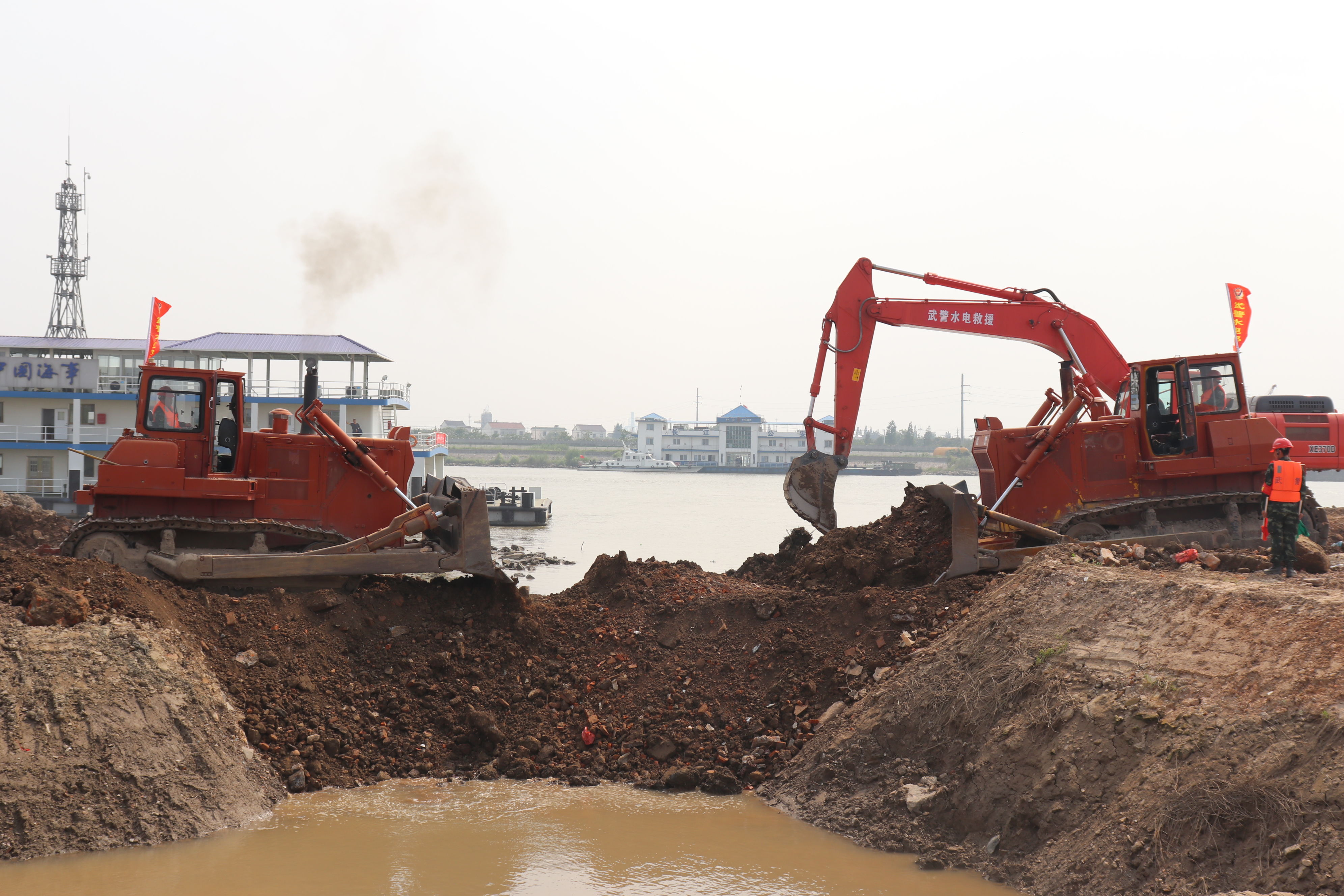 在3号决口处,只见数台大型机械正在紧张作业,他们采取机械立体封堵决口的方式,按照“稳固堤头、单戗立堵、双向进占、防渗闭气”的战法进行处置。挖掘机、装载机、自卸车、推土机紧密衔接、联合作业,向决口处推填大块石、混凝土多面体、钢筋石笼。现场安全员全程警戒,随着最后4个钢筋石笼被推入决口,宣告险情处置完毕。