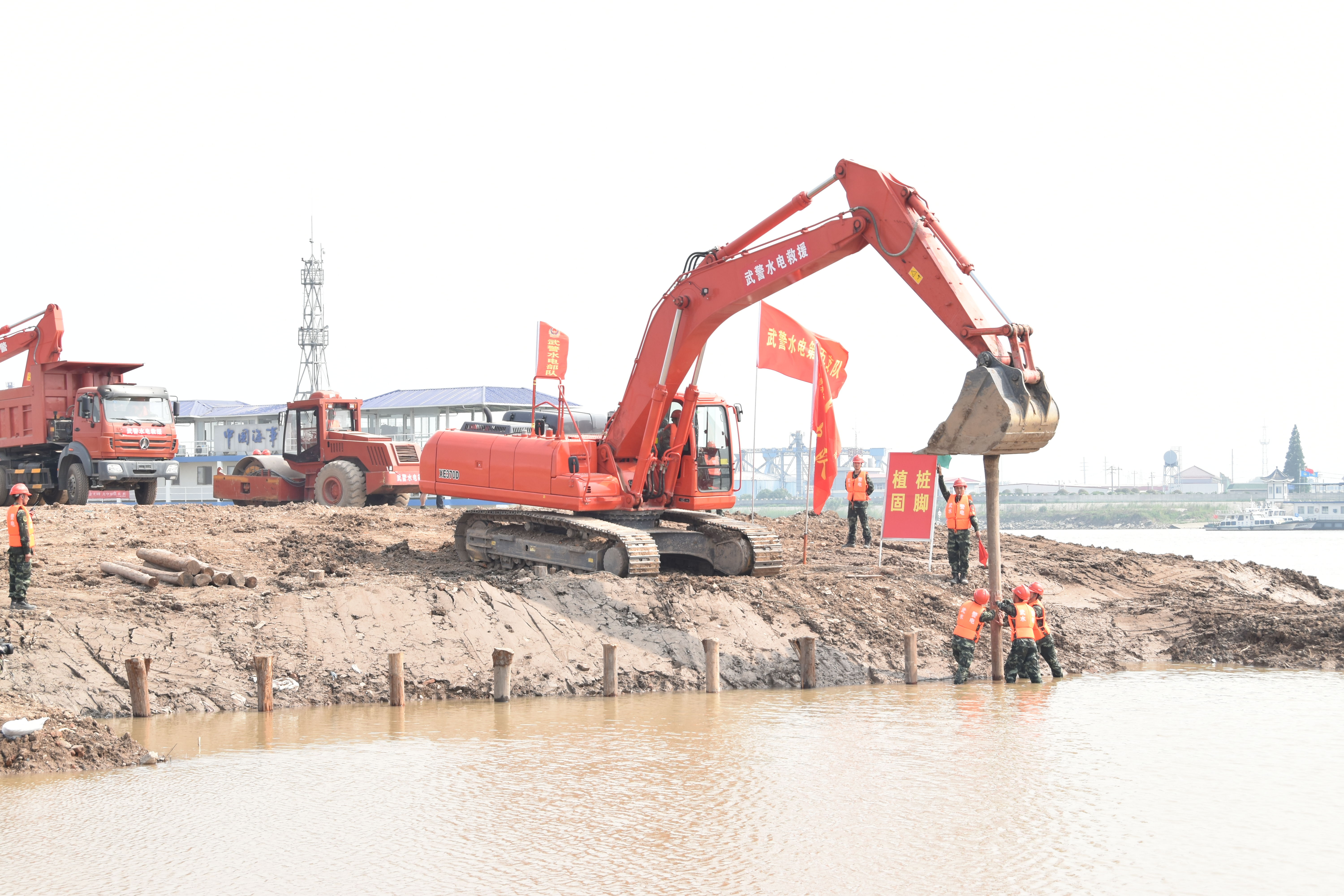 在一滑坡险情处,官兵们发挥挖掘机植桩速度快、效率高的优势,迅速实施机械植装固脚操作,对堤坝出现的滑坡险情进行了有效控制。