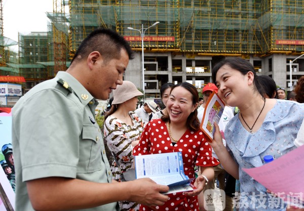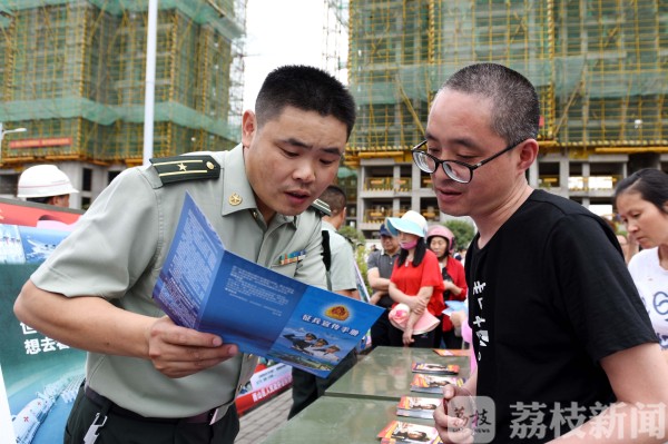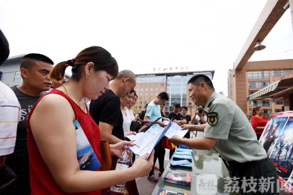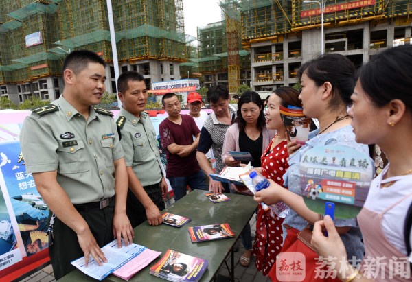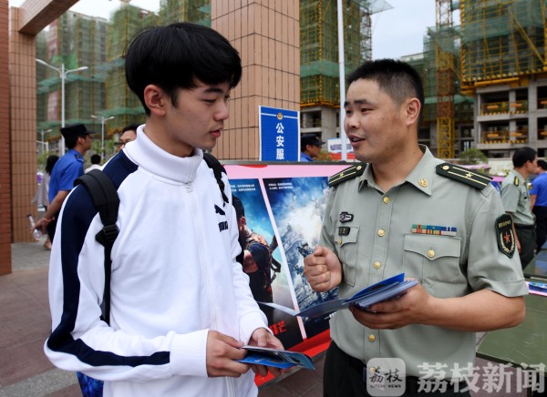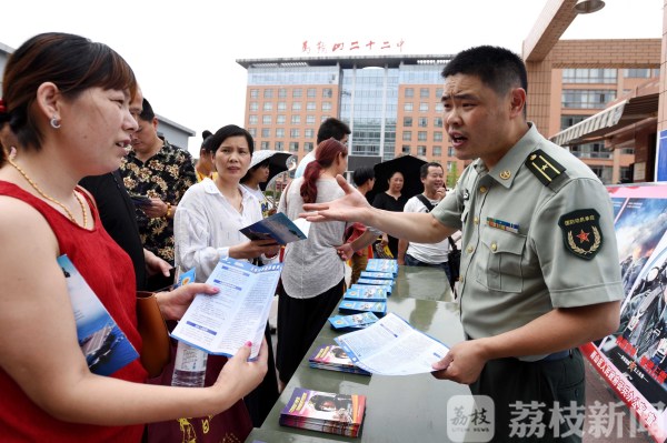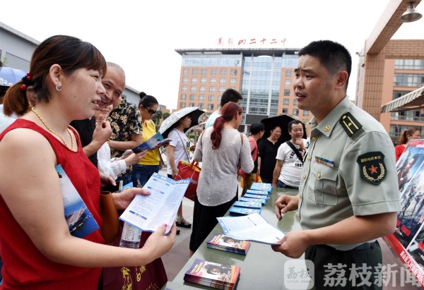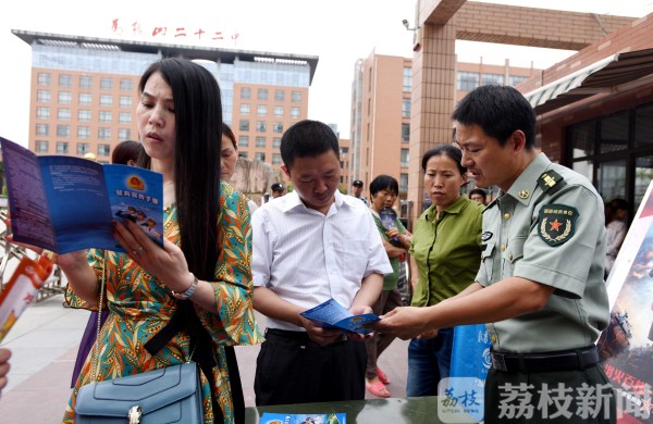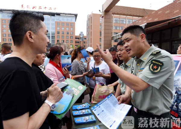 荔枝新闻讯(通讯员/马鞍山市雨山区人武部 刘卫保、徐伟)“考上大学一样可以参军,并且保留学籍……”6月8日下午,2018年普通高校招生全国统一考试结束后,安徽省马鞍山市雨山区人武部在辖区各考点设立“征兵宣传进校园”工作站,通过海报宣传、发放手册、咨询解答等形式,向家长、考生宣讲征兵政策、入伍条件及一对一解疑答惑,营造了一人参军全家光荣的浓厚氛围,激发了广大高考学子携笔从戎、参军报国的政治热情。