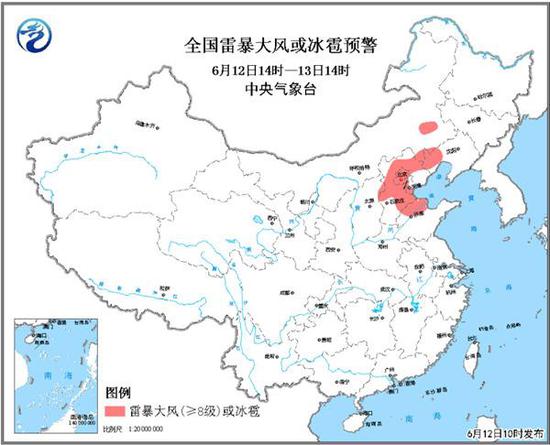中央气象台6月12日10时发布强对流天气蓝色预警:预计6月12日14时至13日14时,内蒙古东部、辽宁西南部、河北大部、北京、天津中西部、山东西北部等地的部分地区将有8级以上雷暴大风,局地并伴有冰雹;内蒙古东部、辽宁西部、河北大部、北京、天津、山东西北部、河南北部将有短时强降水天气,小时雨强20-40毫米,局地50毫米以上;另外,南方地区,云南西部、贵州南部、广西、广东等地将有小时雨强30-50毫米的短时强降水,局地小时雨强可达60毫米以上。