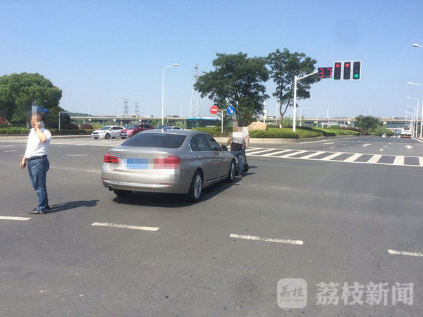 11日下午14:20左右,南京仙林大道与九乡河西路交汇的十字路口,路中央停着一辆宝马轿车,宝马前方横着一辆电动车,一位年轻男子坐在路边,嘴里自言自语。走近跟前,满脸通红,一嘴酒气,一位中年男子正在打电话报警。