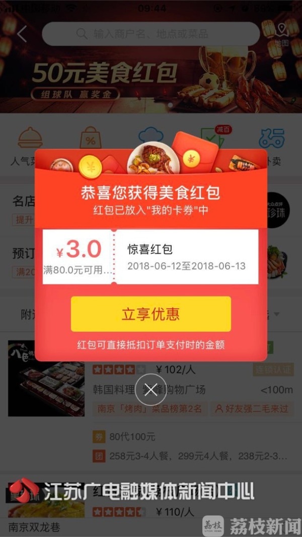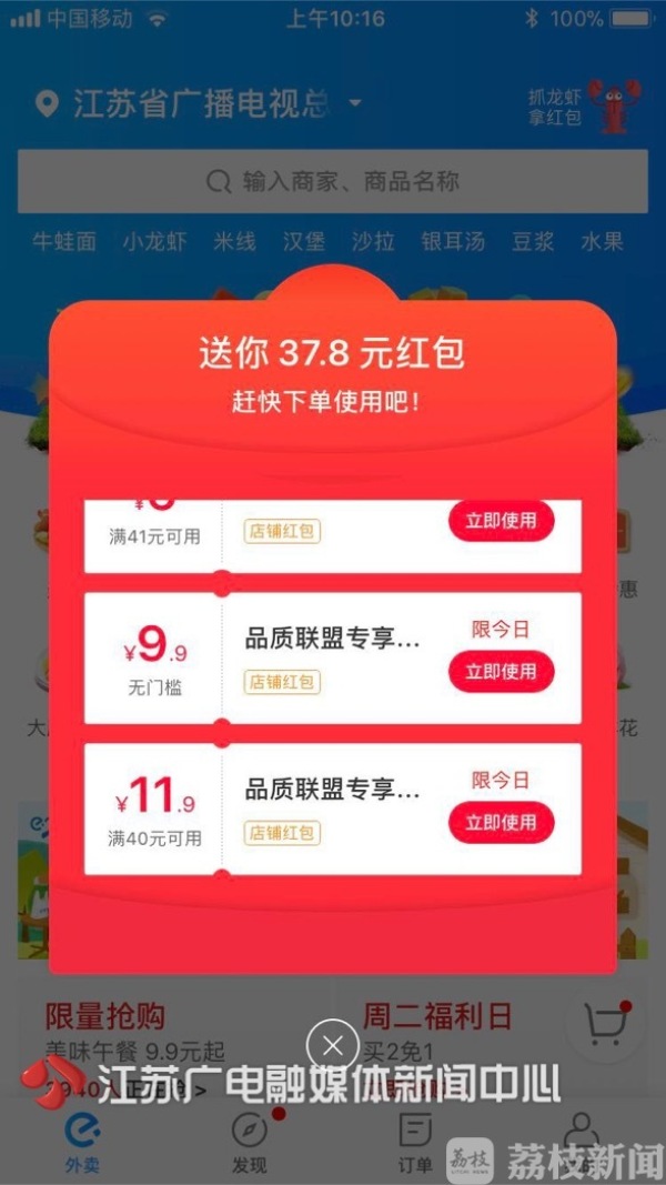 昨天(6月11日),不少习惯于用手机APP点外卖的市民发现,滴滴、美团和饿了么平台不但赠劵突然变多了,而且使用优惠券抵扣后,最后花费也低得惊人。一个三四十元的订单,到手只要几分钱或者几毛钱。难不成,外卖平台为了抢占市场,又开始了新一轮的烧钱大战吗?