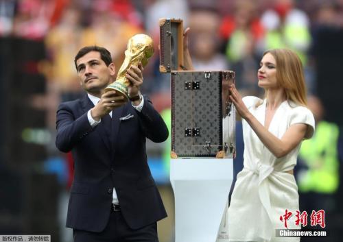 西班牙传奇门将卡西利亚斯与俄罗斯名模沃迪奥诺娃共同将象征着世界足坛最高荣耀的大力神杯带入场内。