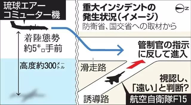 据悉,那霸机场为军民两用机场,事发当时,日本航空自卫队的两架F-15战斗机正准备紧急升空执行拦截任务,但空管人员要求两架F-15战斗机稍等片刻,因为从宫古群岛飞来的琉球空中通勤公司804号航班(庞巴迪DHC8-402型客机,机上共有35人)已经做好着陆姿态准备着陆,这架民用客机当时正在距离跑道约5公里的空域向机场靠近,高度在300米左右,且已经取得着陆许可。