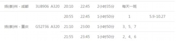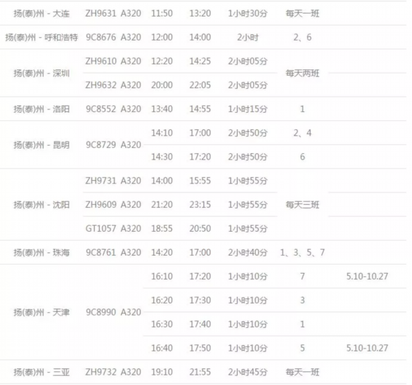 扬州泰州国际机场2018年夏秋季航班时刻表