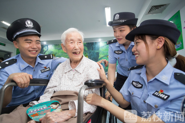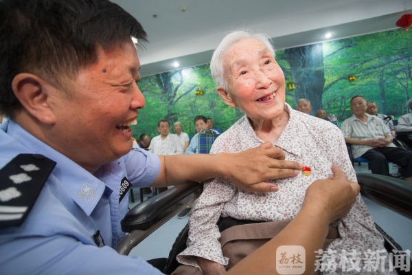 “来,张妈妈,我给您别上新式党徽。”今天,6月19日上午,南京市公安局玄武分局退休民警贺维宁和巡特警大队的青年民警们来到位于江宁汤山的金康天地护养院,为护养院里的老党员们过一个特殊的“党员活动日”。期间,贺维宁兑现诺言,为张娟妈妈别上了新式党徽,97岁的老人脸上露出了“孩子般的笑容”。