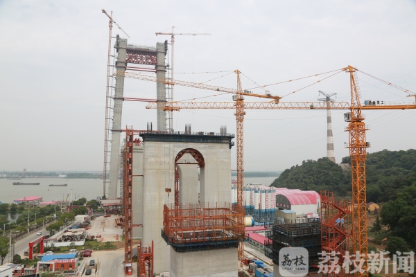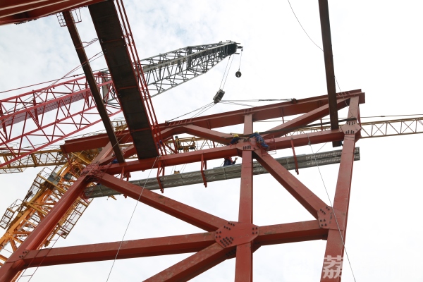 自5月15日南主塔封顶不到二十天时间,4号墩上横梁支架已经全部拼装加固完成,6月14日,上横梁底模铺装全部结束,进入钢筋绑扎阶段,现正完善上横梁第一次浇筑前的准备工作。5、6号墩边跨钢梁支架正在安装,南锚锭散索鞍门架正在拼装,为吊装散索鞍鞍体,及后期主缆架设提前做好准备工作,大桥建设按计划稳步向前推进。