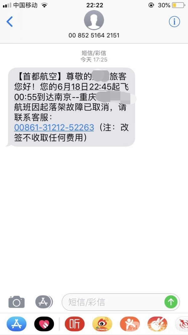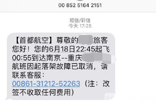 17日下午17时25分。王小姐接到一个“00 852 5164 2151”发来的短信“【首都航空】尊敬的**旅客您好!您的6月18日22.45起飞00.55到达南京--重庆******航班因起落架故障已取消,请联系客服;00861-31212-52263(注:改签不收取任何费用)”
